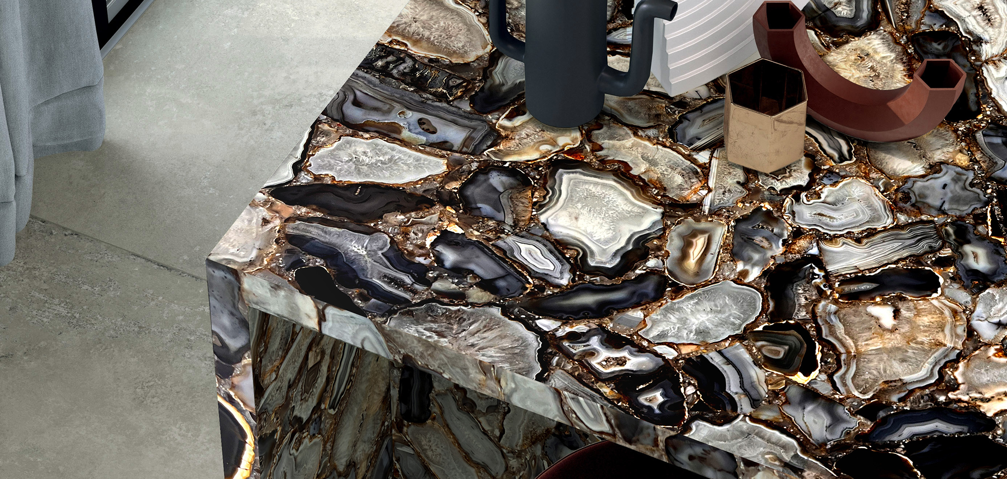 Designers create unique and exclusive spaces with this natural material, being the agate the protagonist piece in their projects. In addition, the wonderful properties of multicolour agate are infinite, as this stone transmits calm, harmony, good energy, without forgetting the great value and beauty that it will bring to any place where it is placed.