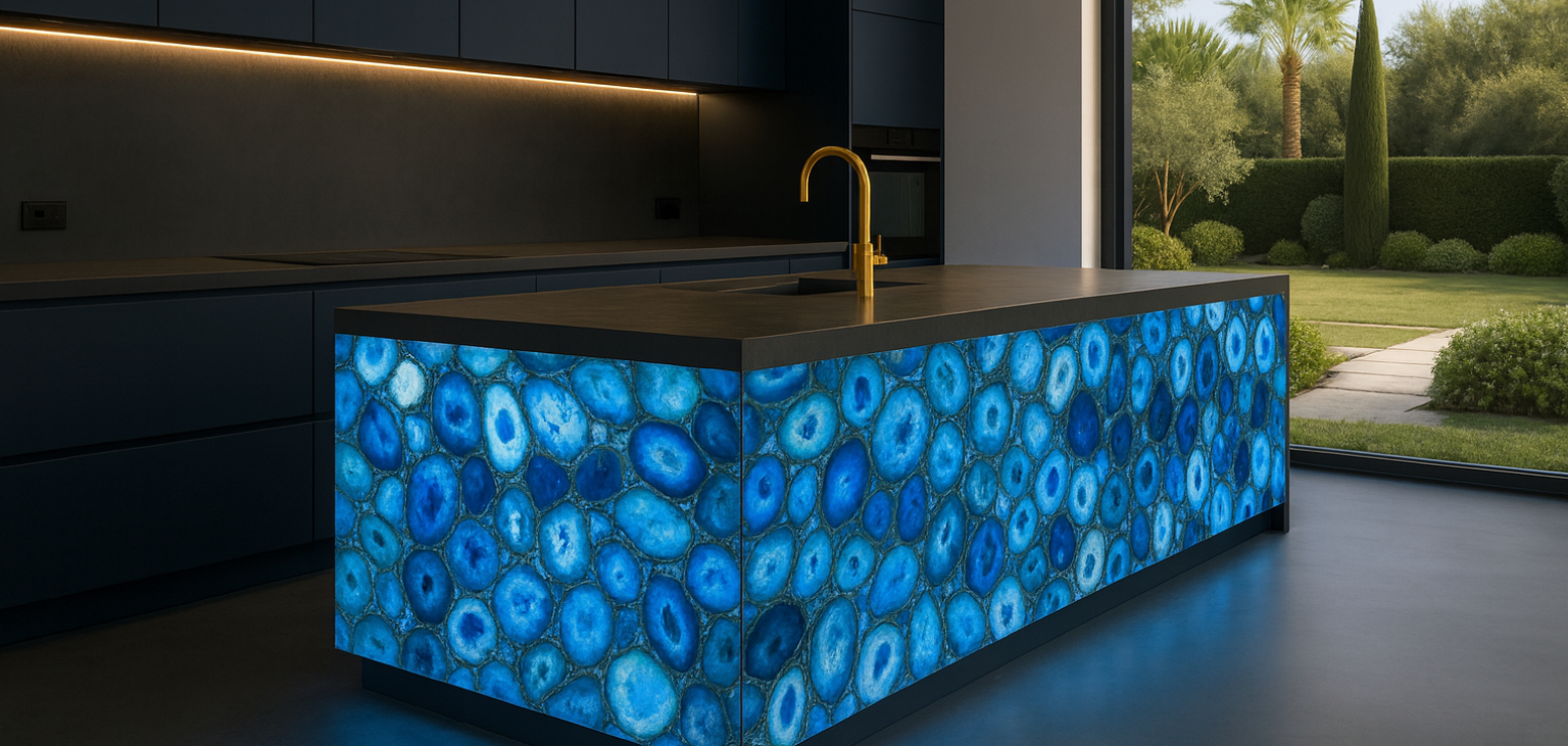 Designers create unique and exclusive spaces with this natural material, being the agate the protagonist piece in their projects. In addition, the wonderful properties of blue agate are infinite, as this stone transmits calm, harmony, good energy, without forgetting the great value and beauty that it will bring to any place where it is placed.